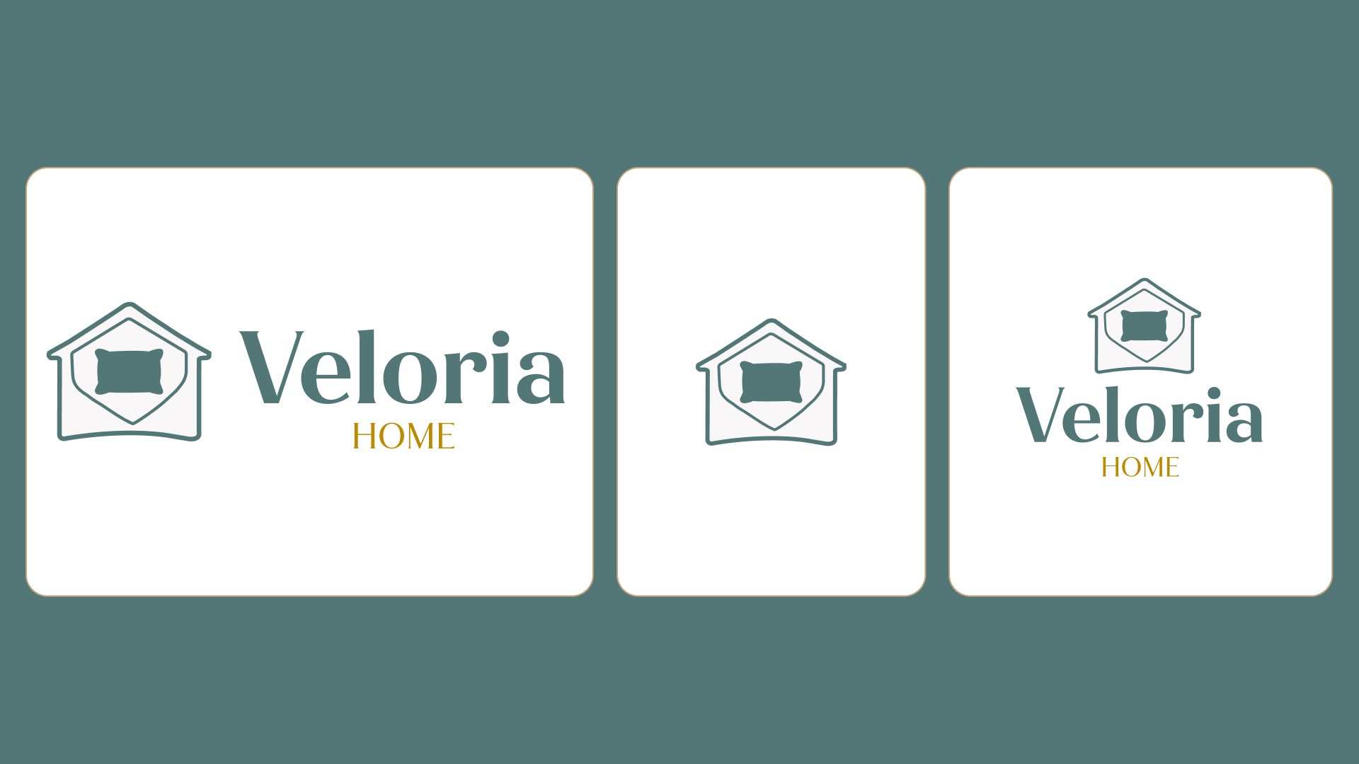 We designed a logo that reflects both the brand name and what Veloria Home does. A simplified home outline frames the mark, with a subtle “V” cut into a rounded triangle. At the centre, a pillow icon doubles as a top-down bed, highlighting the main product categories.